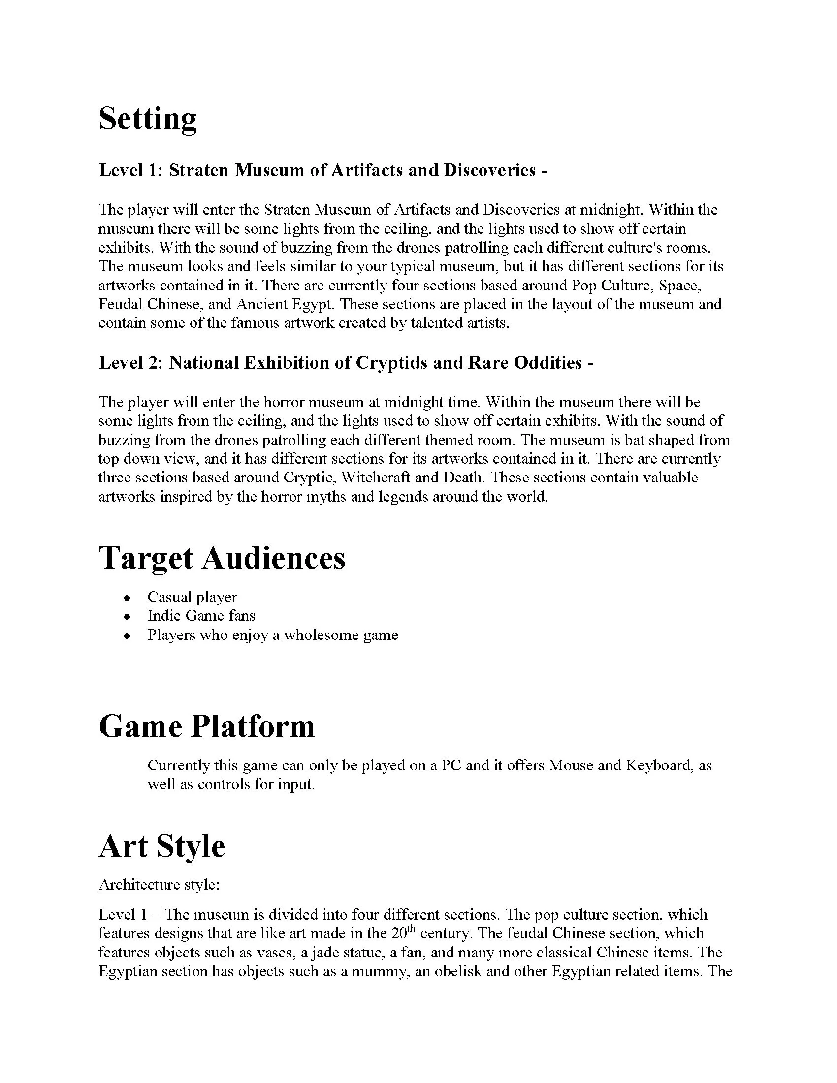 The two levels in this game are museums with different themes, and the player can repeatedly challenge either site to get a higher score than their previous attempts. The first level, the Straten Museum of Artifacts and Discoveries (SMAD), features artworks from 4 different cultures; The second level, the National Exhibition of Cryptids and Rare Oddities (NECRO) presents cursed artifacts across the world.